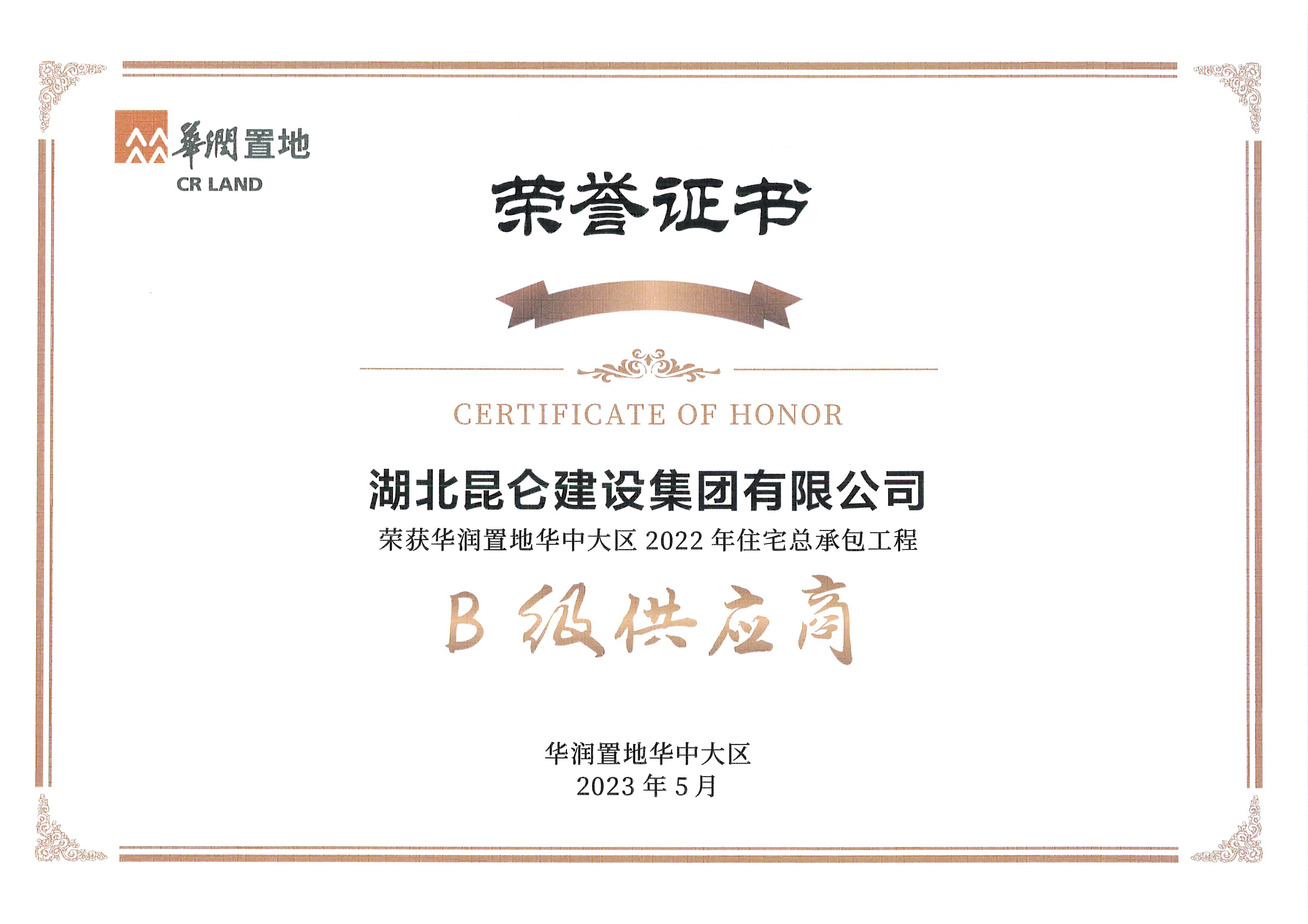 2023年5月榮獲華潤置地供應(yīng)商“攻艱克難獎(jiǎng)”